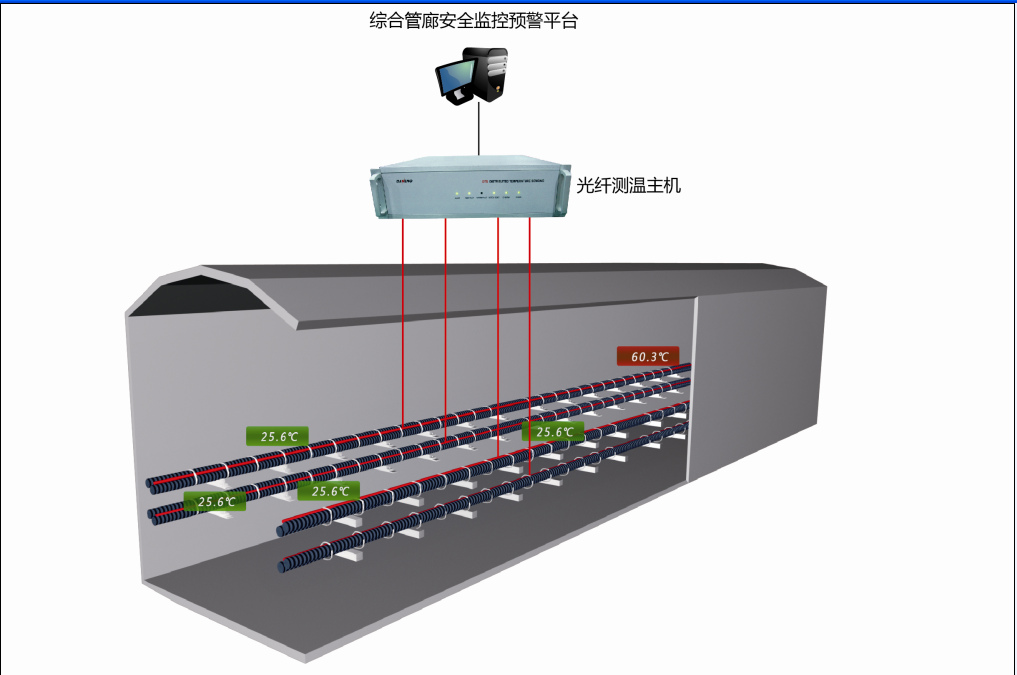 温度监测是目前国内外电缆运行监测中被认可的一项重要手段。电缆接头阻抗增加、电缆负荷过大、绝缘皮老化或者电缆本身局放等原因,致使电缆表面产生温升,电缆绝缘层和保护层产生阴燃,并伴随热量、可燃气体的产生,随着温度进一步上升则产生烟雾,进而发展为火灾。分布式测温系统通过实时监测电缆温度变化,在事故发生初期准确判断异常,提前预警,并精确定位,防患于未然